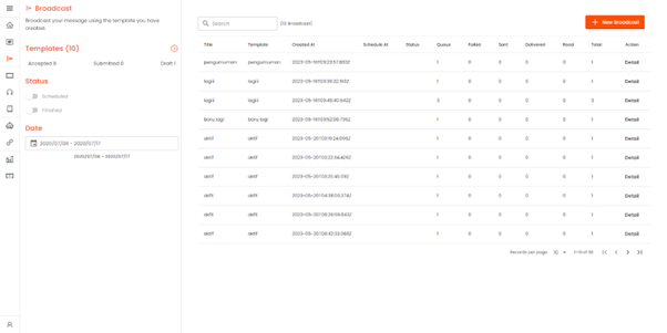 Menu broadcast digunakan untuk mengirimkan pesan dalam jumlah banyak. Dalam layanan Omnichannel pro, ketika ingin melakukan broadcast pesan. Silahkan mendaftarkan template terlebih dahulu, kemudian jika status template sudah aktif, maka broadcast bisa dilakukan.