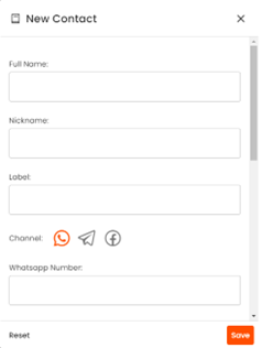 2. Pada field new contact, anda dapat menambahkan nama kontak, nama panggilan, label, channel, email, company, address, city, category, dan notes.