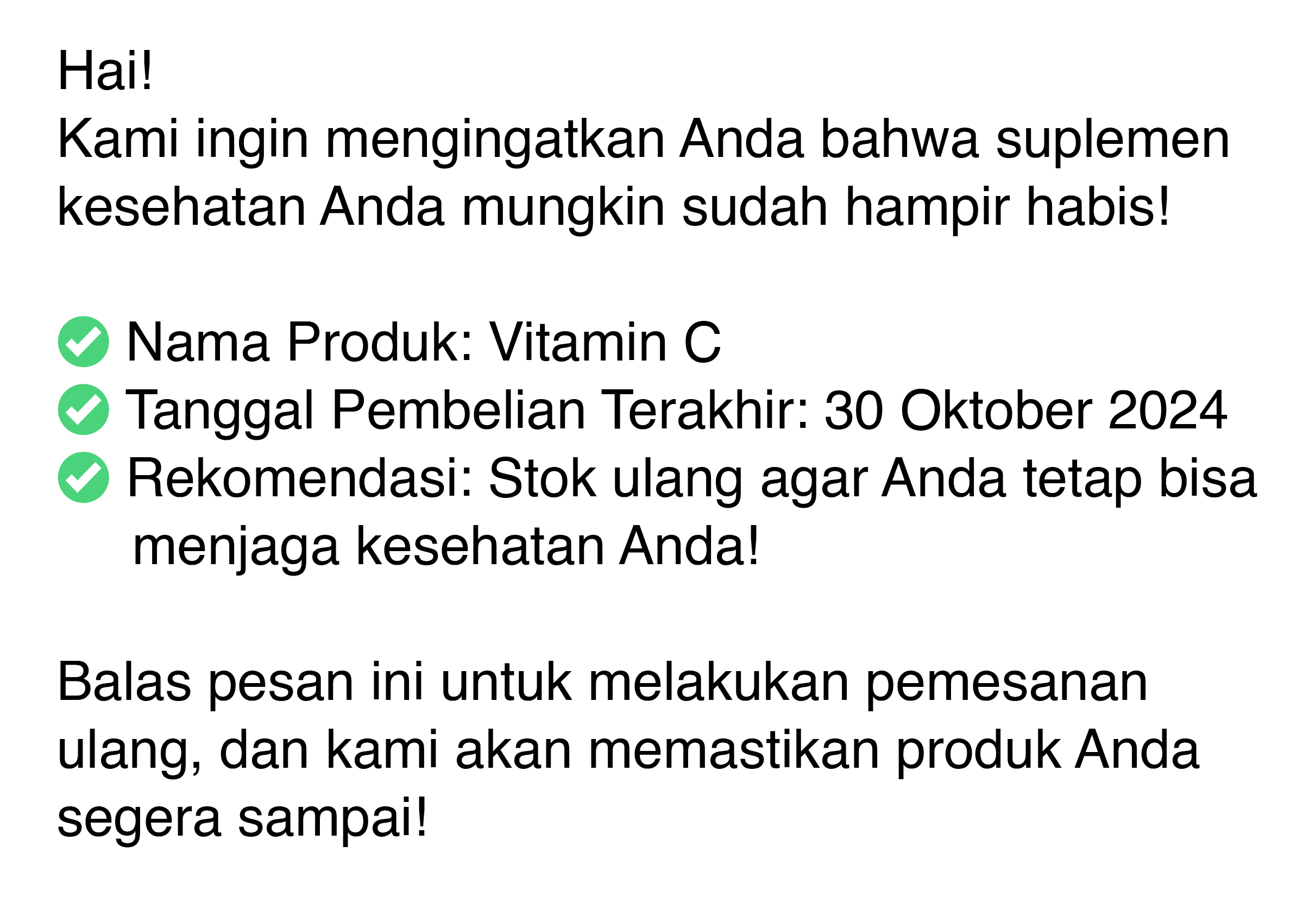10.Pengingat Produk Habis: Berdasarkan riwayat belanja konsumen, kirimkan pengingat saat mereka hampir kehabisan produk.