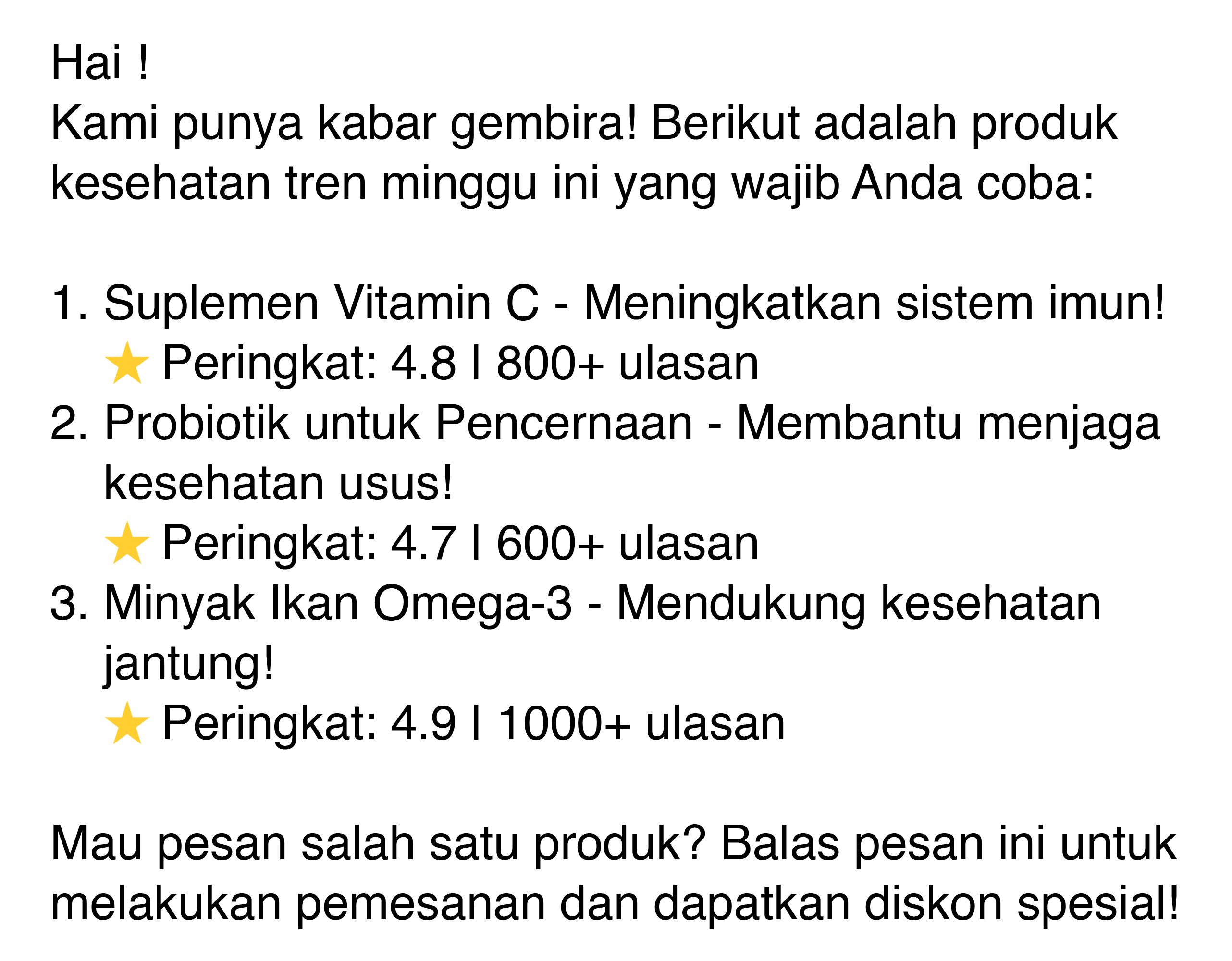 3.Produk-Produk Tren Minggu Ini: Identifikasi produk kesehatan dan kebugaran yang sedang naik daun dan buat kampanye yang menyoroti tren ini agar audiens Anda tetap up-to-date.