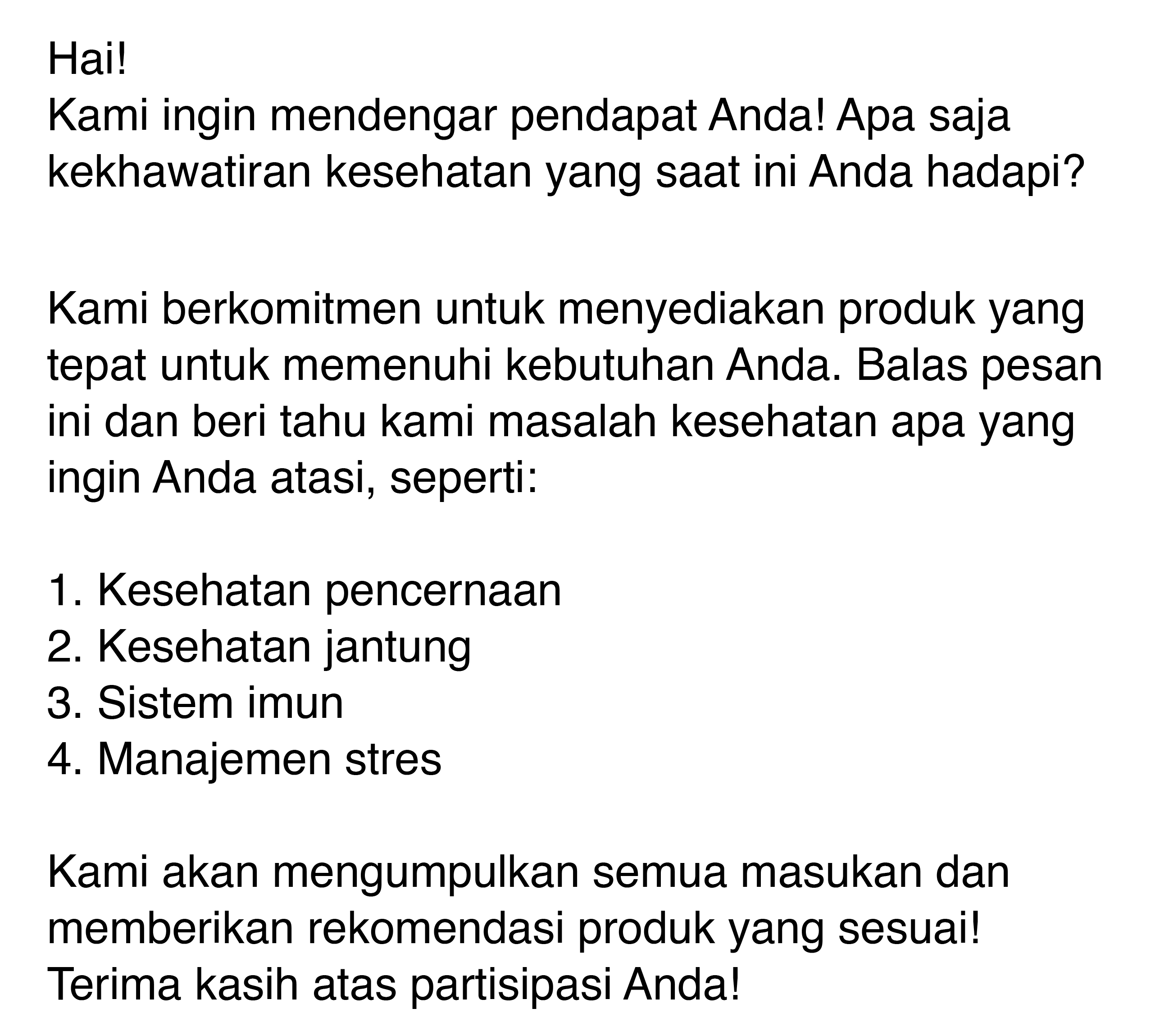4.Kumpulkan Info Kekhawatiran Konsumen: Beri opsi di pesan interaktif WhatsApp agar konsumen bisa memilih topik kesehatan yang ingin mereka pelajari.