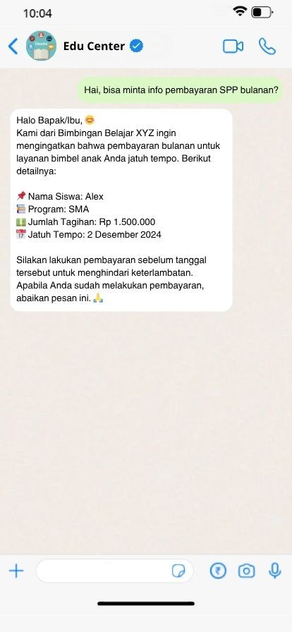 Jawaban otomatis untuk pertanyaan seperti "Kapan jadwal ujian?", "Berapa biaya SPP?", atau "Bagaimana cara pindah kelas?".