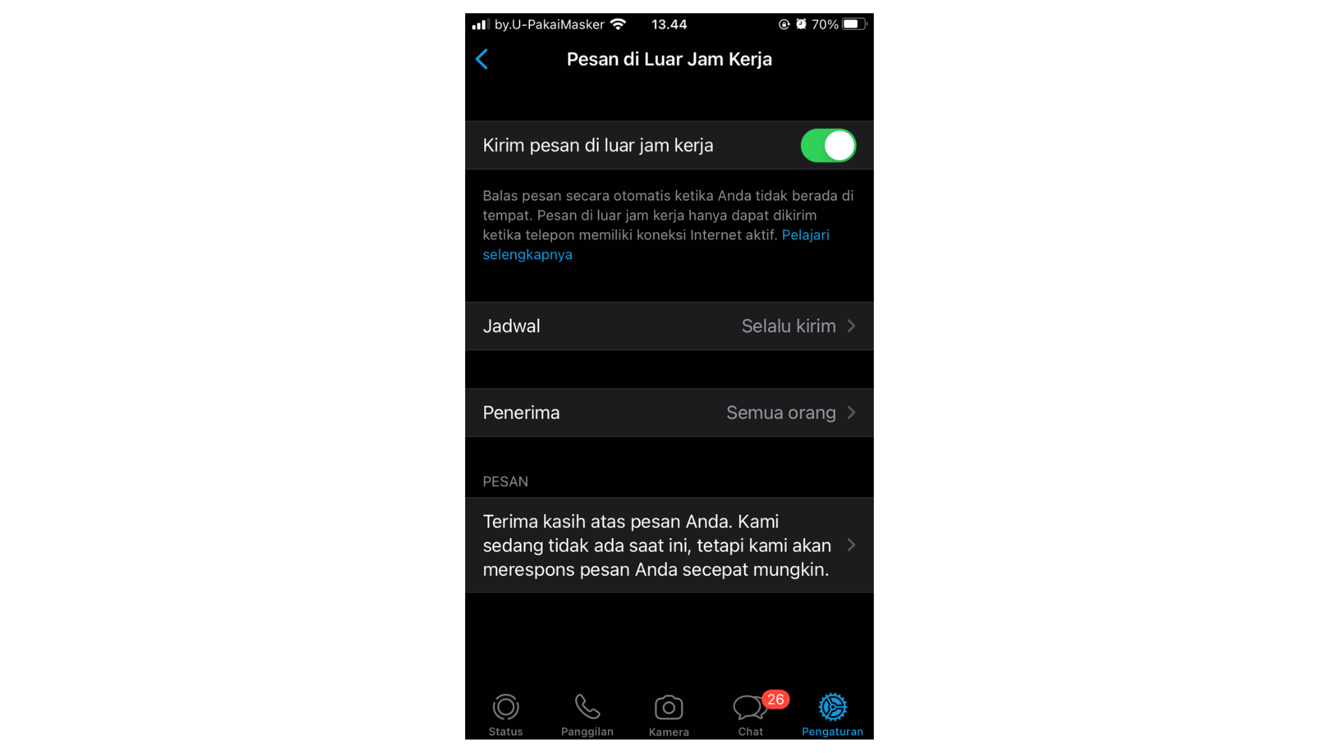 Fitur ini akan mengirimkan pesan kepada orang yang menghubungi diluar jam kerja/operasional bisnis Anda secara otomatis. Sebaiknya tulis pesan yang memberitahu mereka, jam operasional bisnis Anda berakhir. Pelanggan akan dihubungi kembali keesokan harinya.